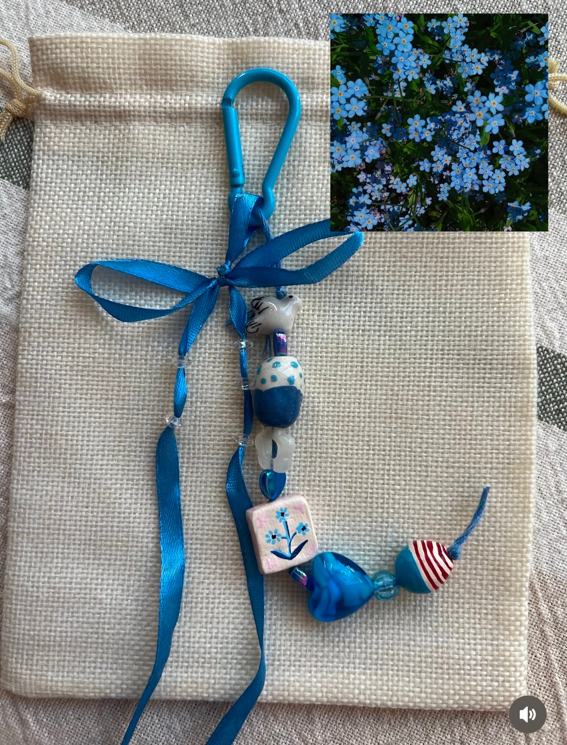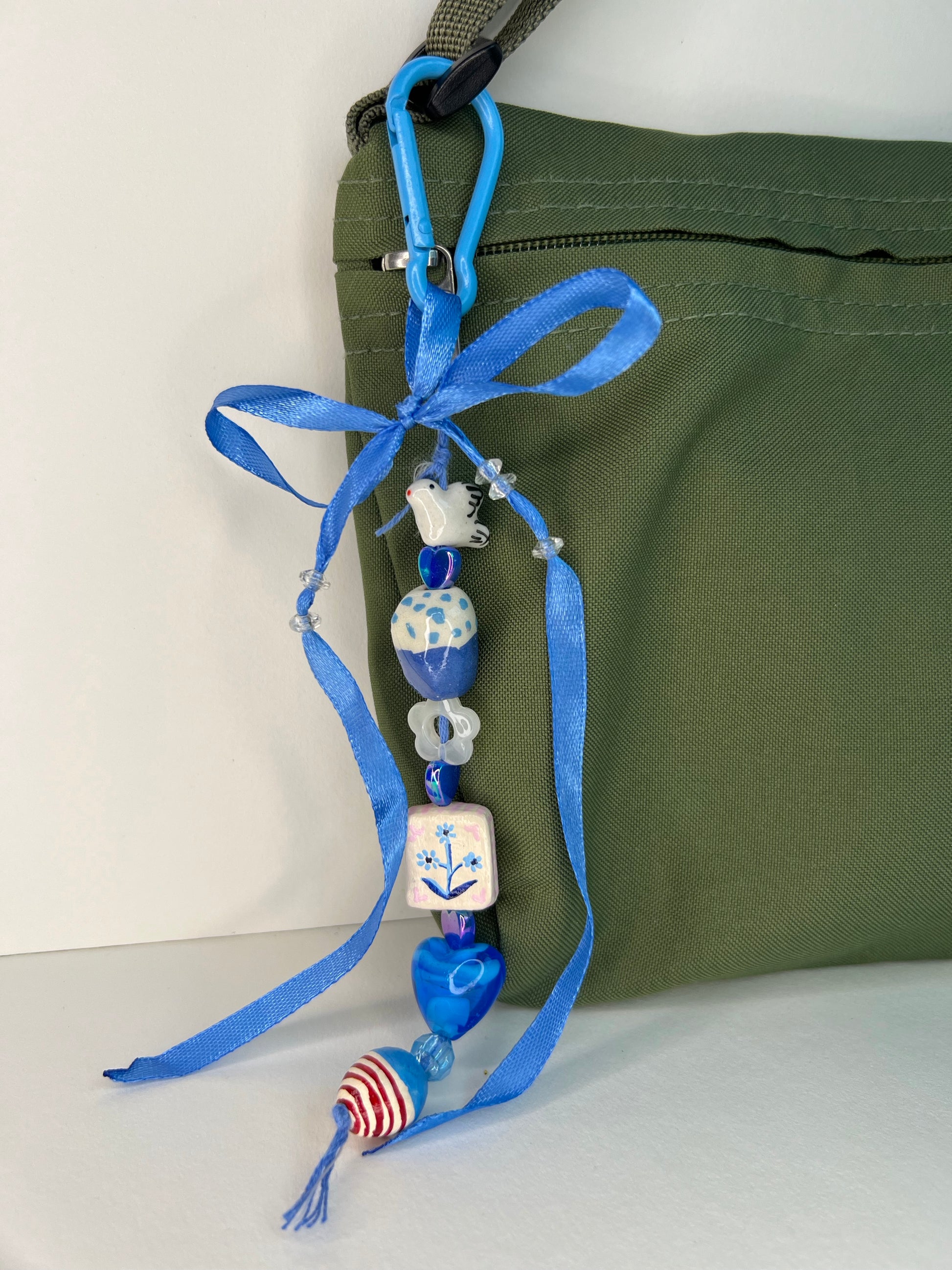 Glass, ceramic, acrylic, air dry clay, polyester cord, ribbon, metal carabiner.