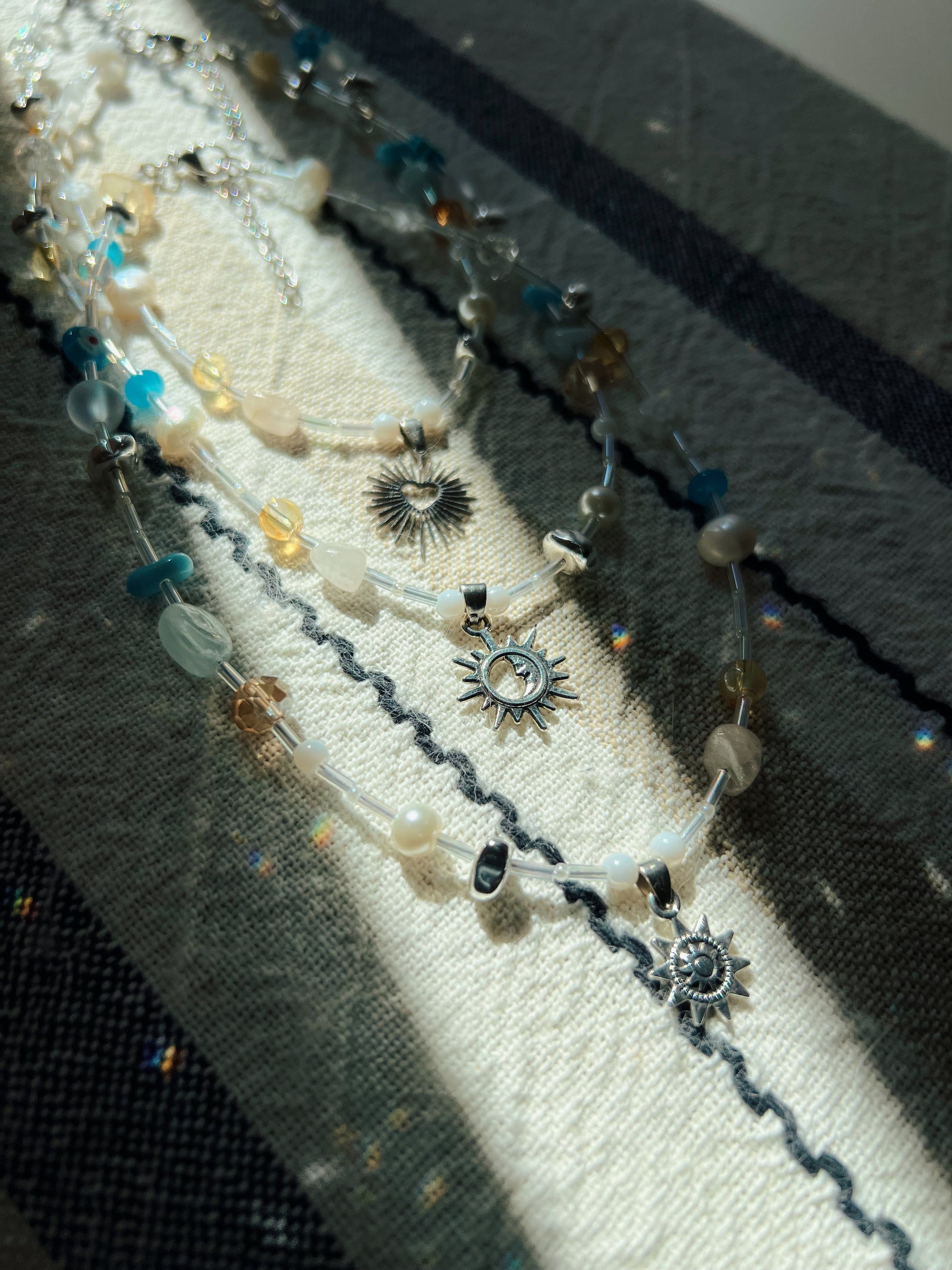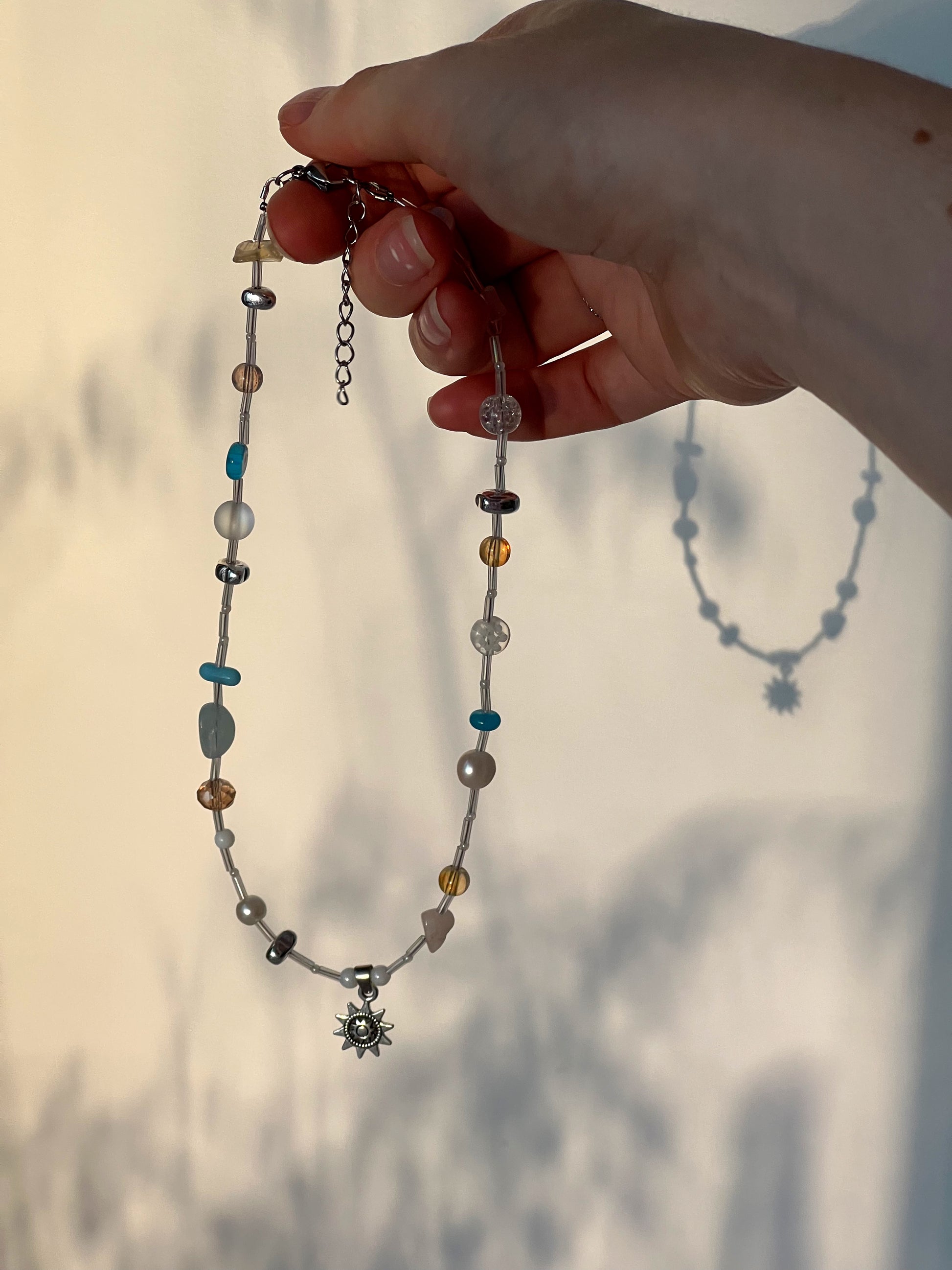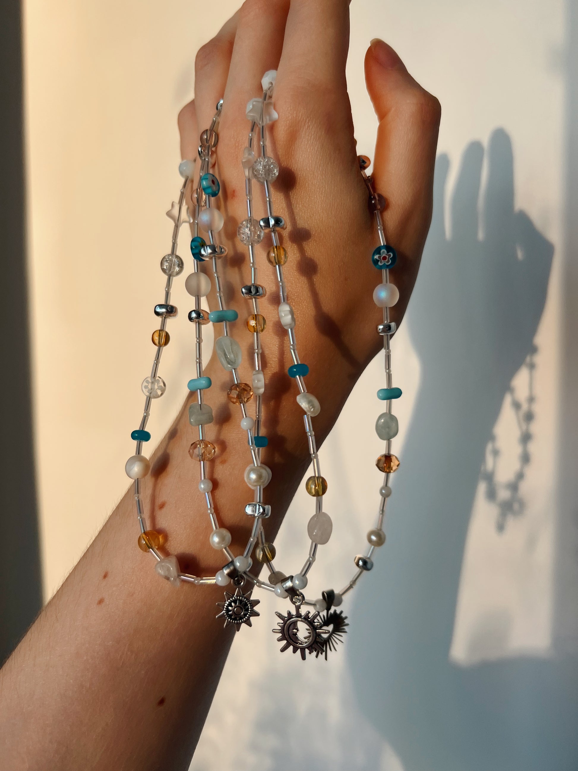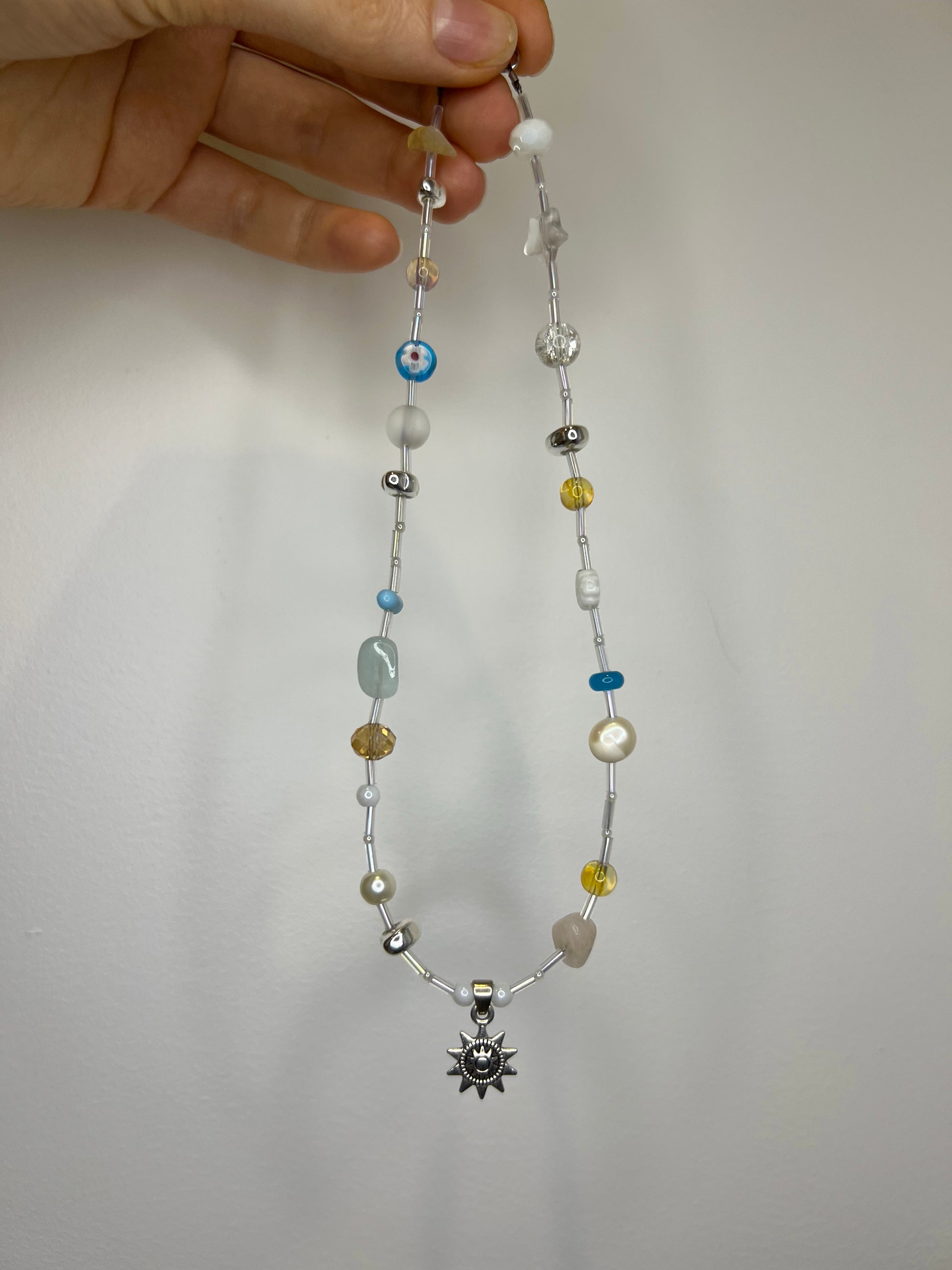 Glass, steel pendant, freshwater pearls, hematite, acrylic, natural stone beads, stainless steel. Single copy. Length - 38cm (+4cm)