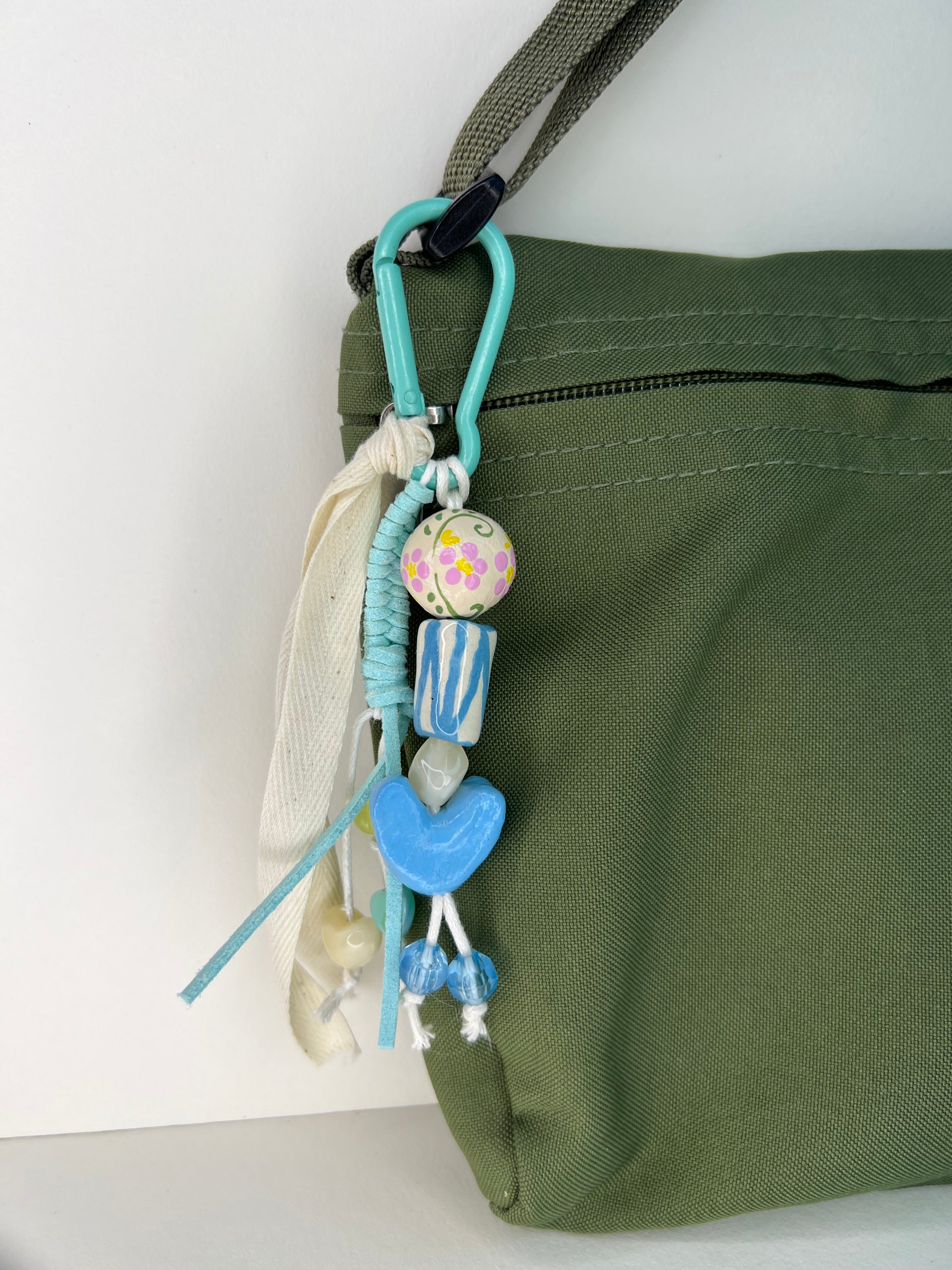 Ceramic, acrylic, air dry clay, polyester cord, cotton ribbon, metal carabiner.