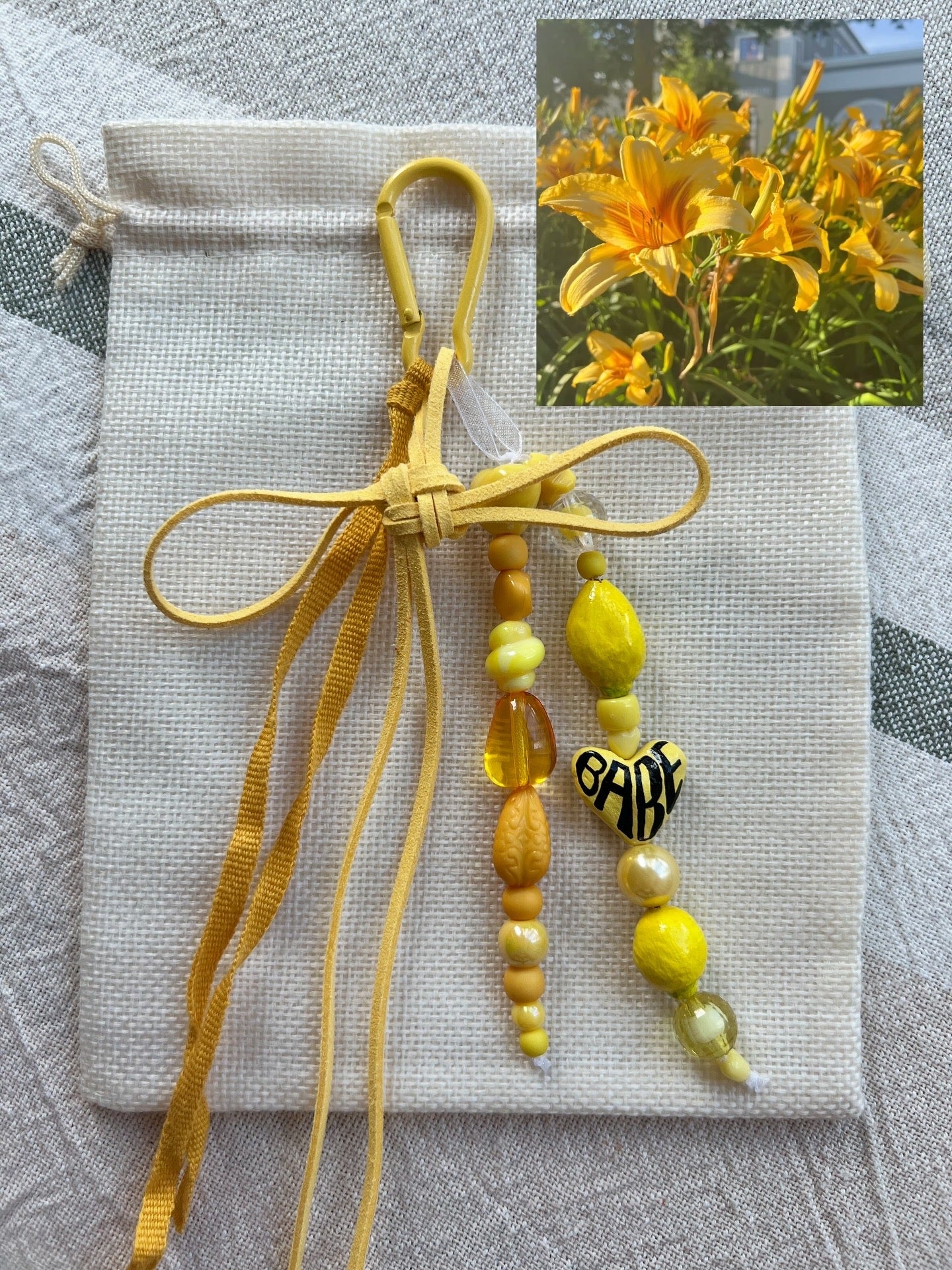 Acrylic, air dry clay, polyester cord, ribbon, metal carabiner.